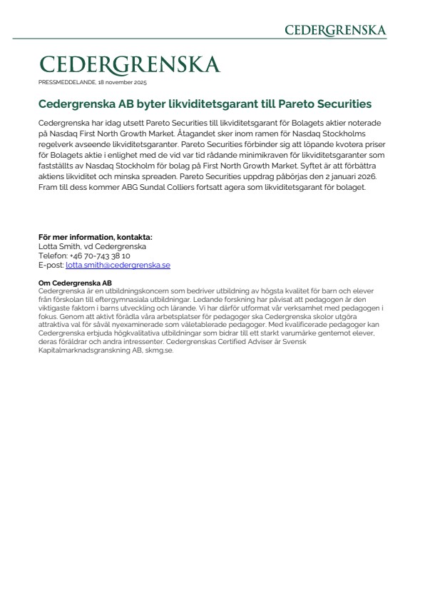 Cedergrenska har idag utsett Pareto Securities till likviditetsgarant för Bolagets aktier noterade på Nasdaq First North Growth Market. Åtagandet sker inom ramen för Nasdaq Stockholms regelverk avseende likviditetsgaranter. Pareto Securities förbinder sig att löpande kvotera priser för Bolagets aktie i enlighet med de vid var tid rådande minimikraven för likviditetsgaranter som fastställts av Nasdaq Stockholm för bolag på First North Growth Market. Syftet är att förbättra aktiens likviditet och minska spreaden. Pareto Securities uppdrag påbörjas den 2 januari 2026. Fram till dess kommer ABG Sundal Colliers fortsatt agera som likviditetsgarant för bolaget.