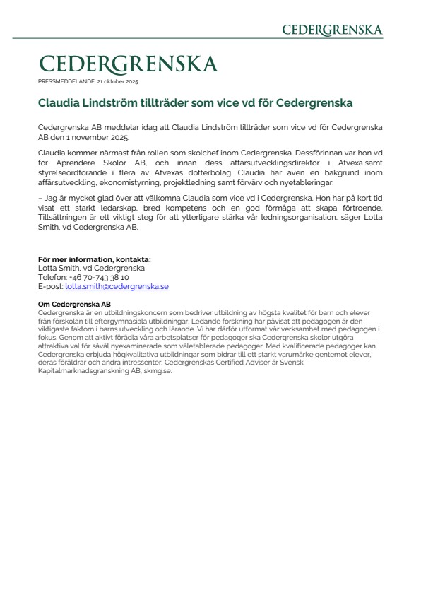 Cedergrenska AB meddelar idag att Claudia Lindström tillträder som vice vd för Cedergrenska AB den 1 november 2025.
